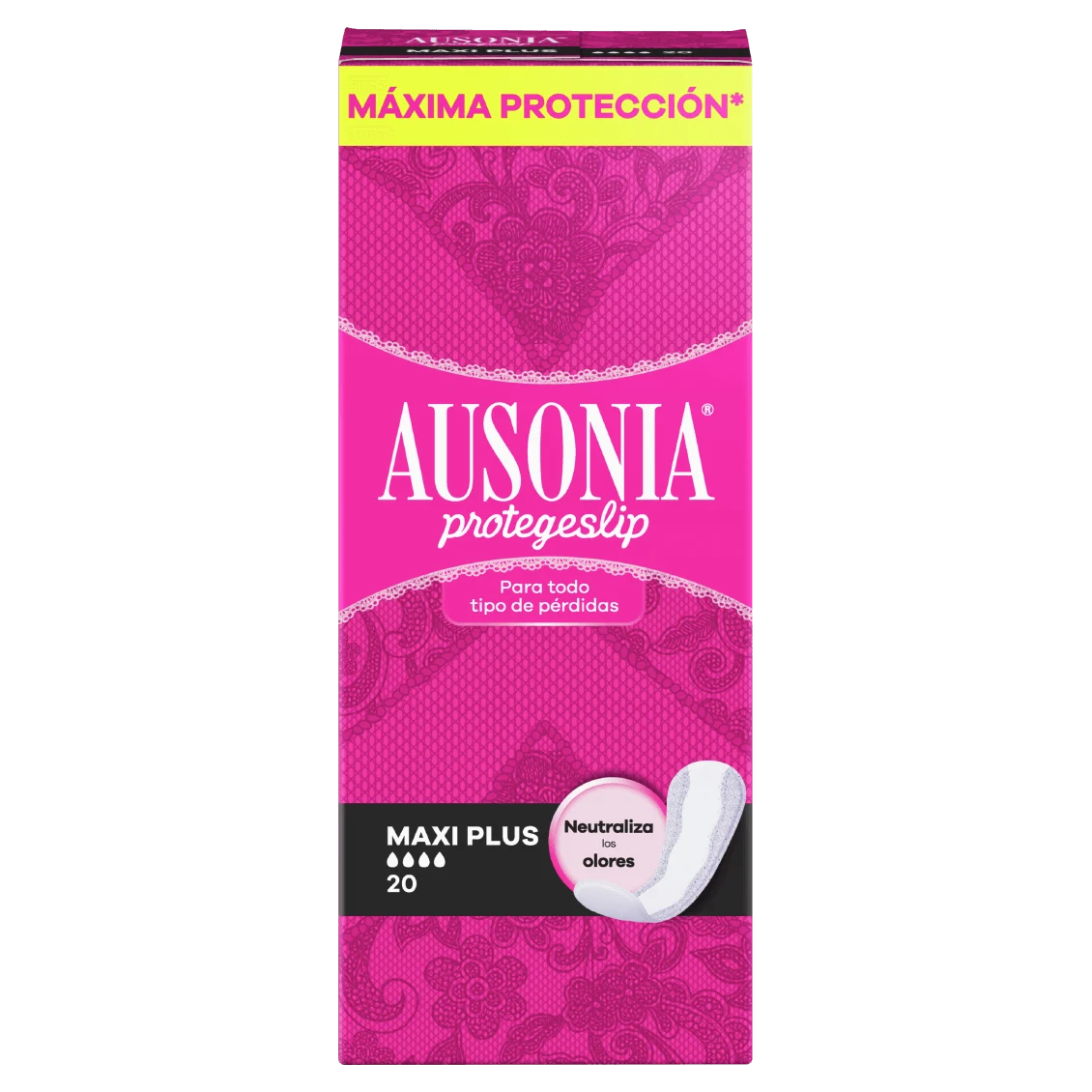 Los protegeslips Ausonia Maxi Plus te ofrecen la máxima protección y son ideales para uso diario. Estos protegeslips económicos y fáciles de usar están dermatológicamente testados y se han diseñado específicamente para mantenerse en su sitio y neutralizar los olores. Sus zonas de protección lateral y su núcleo absorbente te mantienen segura y seca; por eso, te protegen diariamente contra todo tipo de pérdidas.